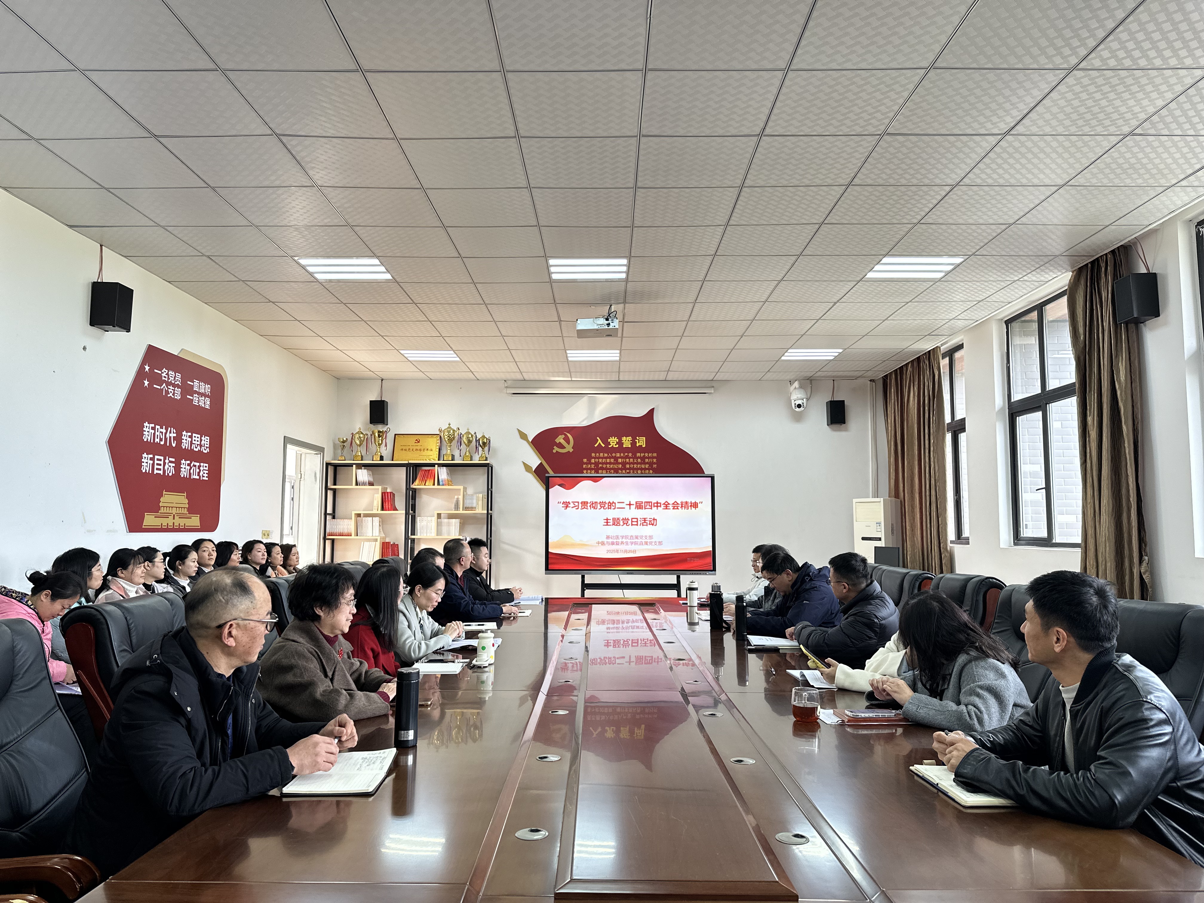 为充分发挥思政教育引领作用,推动党的二十届四中全会精神在基层党组织落地落实,11月25日,学校“薪火”宣讲团成员、马克思主义学院思政课教师何衡,受邀在中医与康复养生学院303党员活动室,为基础医学院直属党支部、中医与康复养生学院直属党支部全体党员,作党的二十届四中全会精神专题宣讲。